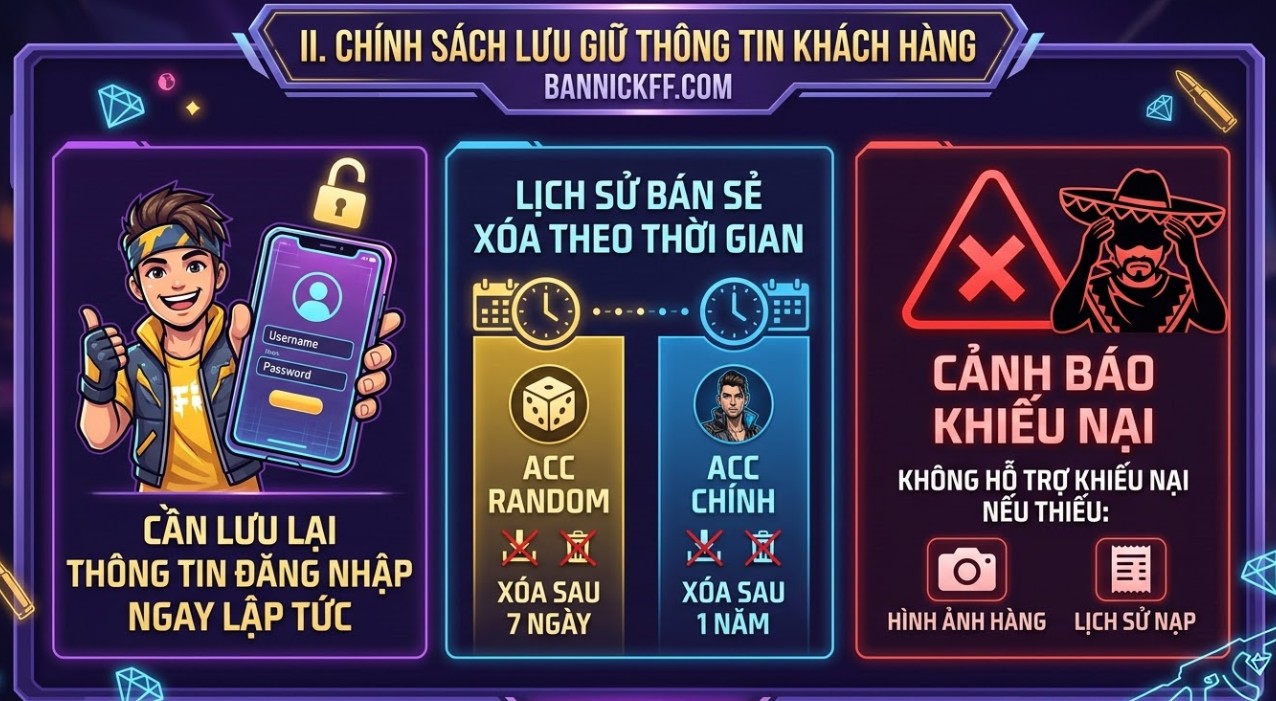 Tại Bannickff.com, chúng tôi áp dụng quy trình quản lý dữ liệu nghiêm ngặt nhằm tối ưu hóa hệ thống và bảo mật tuyệt đối cho khách hàng. Sau khi giao dịch thành công, quý khách vui lòng lưu ý các quy định về lưu trữ sau đây: