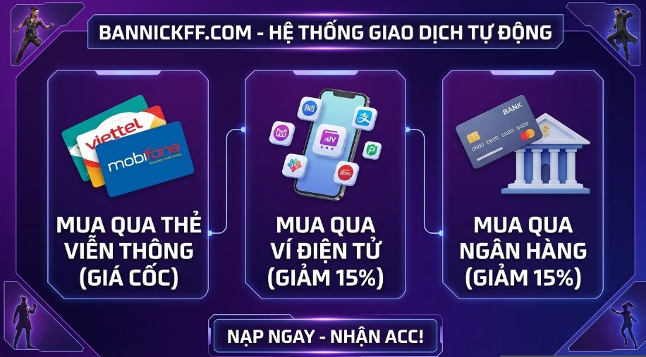 BannickFF.com hỗ trợ người dùng mua nick qua 3 hình thức : Card viễn thông, và ngân hàng. Giá bán hiển thị nick Free Fire tính theo giá card, khi quý khách nạp tiền qua ví điện tử, ngân hàng sẻ được giảm giá 15%.
